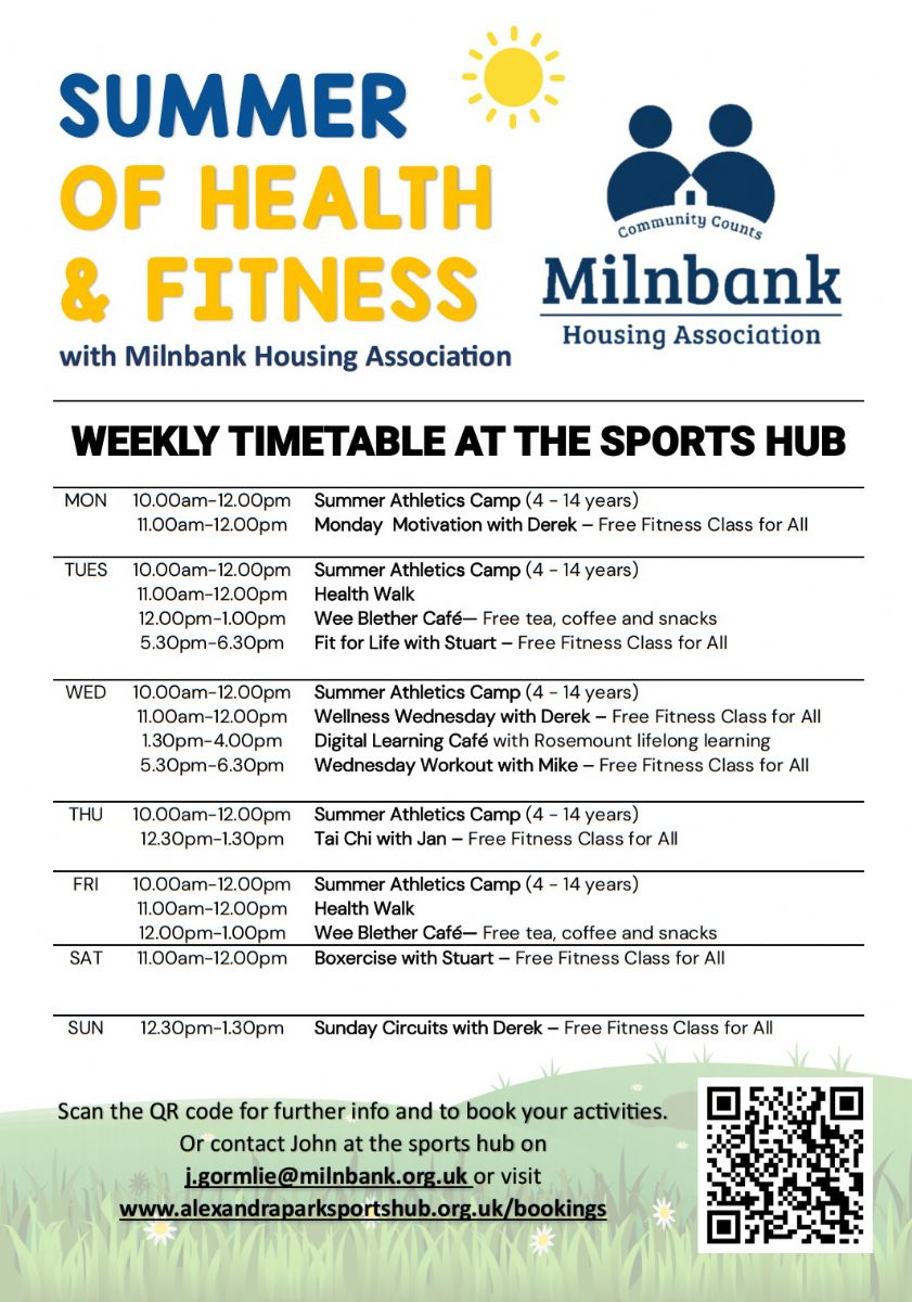Milnbank Housing Association’s Summer of Health and Fitness is here. Our brilliant FREE adult activities continue 7 days a week. Our Easter and Summer Camps for the kids were so successful we are doing it all again! Every weekday during the school holidays from 27 June to 12 August we will have qualified athletics and fitness coaches here to work with the kids.
